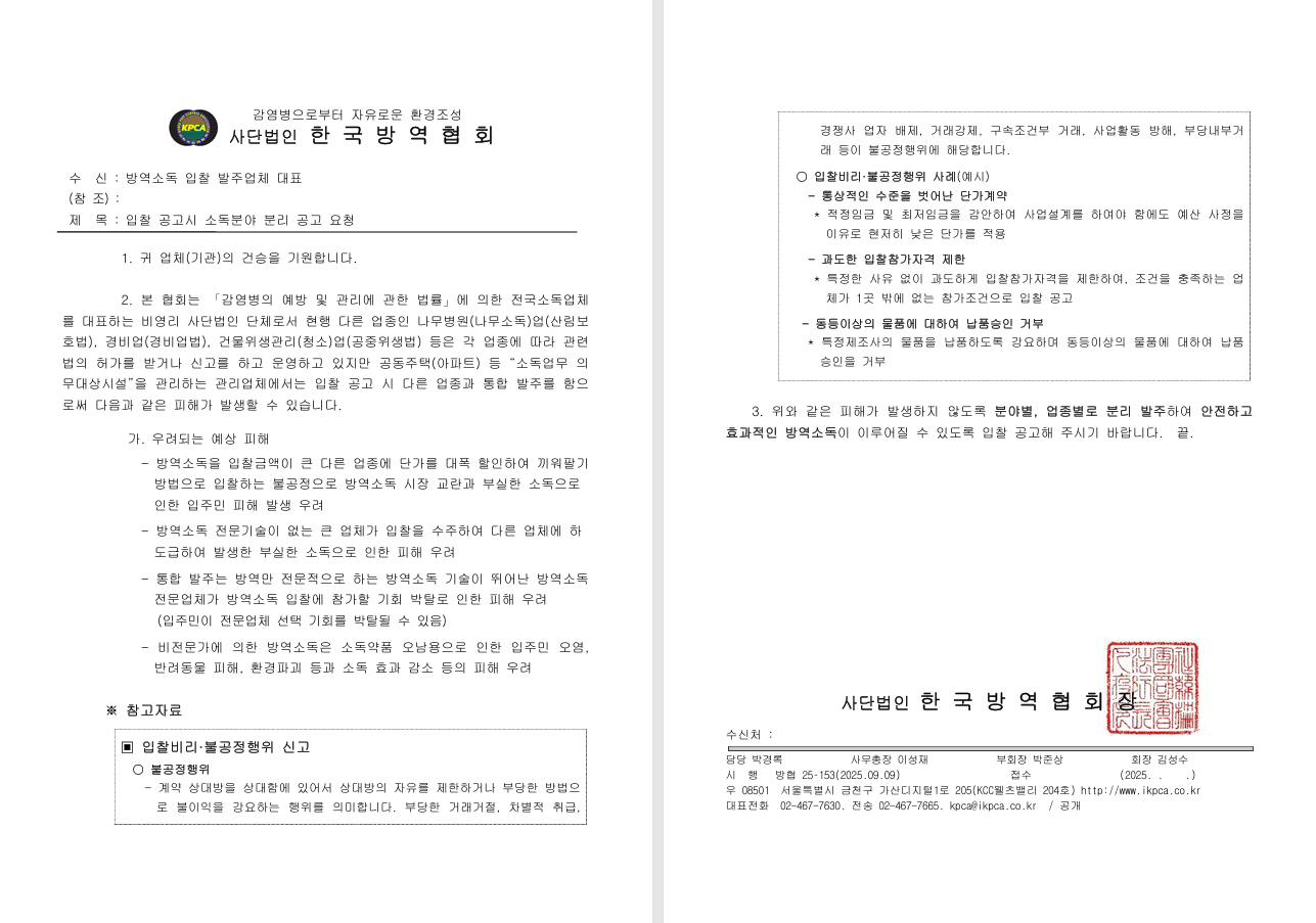 (후원-협회) 한국방역협회, 공동주택(아파트) 입찰 통합 발주시 우려되는 피해 관련 문서 공유